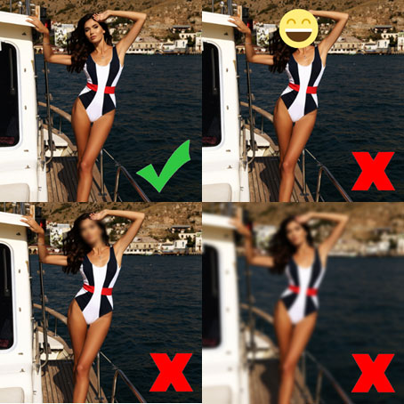 Leginkább a hölgyeknél jellemző, mikor a strandon, vagy egy lengébb ruházatban hátulról fotózva töltenek fel képet, amelyen az arc nem látszik. Ilyen jellegű fotóknál elhomályosítást nem tudunk elfogadni, hiszen alapból felismerhetetlen a személy a képen.