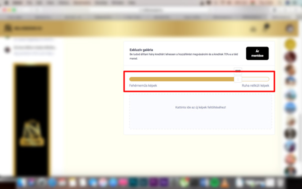 A szövegdoboz felett láthatsz egy csúszkát, amelyen a legkisebb érték 100 kredit, a legnagyobb pedig 1000 kredit. Itt beállíthatod, hogy hány kreditért lehessen megvásárolni a hozzáférést a galériádhoz. Érdemes reális összegre állítani, hiszen azt hozzáférés nélkül is látják a felhasználók, hogy hány darab képed van fent a galériádban. Húzd ahhoz az értékhez, amely neked megfelel és kattints rá az “Ár mentése” gombra!